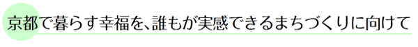 財政や経済成長といった金銭的な勘定だけで問題解決をせず、幸福感を尺度とした「ハピネス都市」の実現は、金銭的な状況も改善へとつながるはずです。これまでと違う視点で行政を見直し、住民一人ひとりが誇りを持ち続けられる「京都らしい」行政が望まれています。