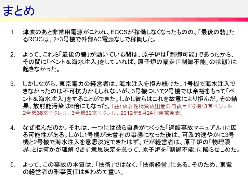 ではなぜ東電の経営者は海水注入を意図的に拒んだか。 それは、非常用電源が失われたらすぐ「ベントと海水注入」をやるのではなく、ぎりぎりまでねばってやるという「過酷事故マニュアル」に因る可能性があります。 しかし、1号機が未曾有の事態になった時、可及的速やかに3、2号機で海水注入を意思決定できたはずです。 にもかかわらず、東電の経営者は、暴走すれば人知を超える原子炉の「物理限界」とは何かが理解できず、意思決定を怠って原子炉を制御不能に陥らしめた。 福島原発の事故は、技術ではなく、実に東電経営者の「意志決定をしなかった」という「過失」に他ならず、よってその刑事責任は極めて重い、というのが私の主張です。