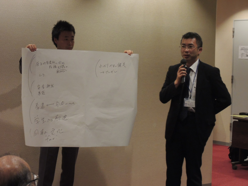 「科学者と市民をつなぐ」ということで話し合いました。 行政が悪い、マスコミのレベルが低いということが今回もたくさん指摘されましたが、実は、市民の教育こそ大切ではないか。 教育については、学校教育が重要な意味を持っているのだが、今は受験勉強に特化していて、そこから、自分のことしか関心のない市民、一方で、自分の専門の事しか知らないというような研究者につながっていく。 例えばもっとバランスのいい教育を行い、両方でリテラシーを上げていくことが重要ではないかという意見もありました。 別の意見としては、原子力の平和利用としていいことだと思って研究した原発が、こんなに悪い結果もたらしたわけですが、例えばiPS細胞やクローン人間など、科学者は、その結果がどう利用されるか、いいか悪いか関係なしに研究を進めるということがあります。 この時、暴走が考えられるわけですが、市民の側も、それに対して科学音痴であってはならず、制御するリテラシーを持つべきではないかと。 生活教育というか、誰もが大学にふっと行って教育の受けられるようなシステムを作ったらどうかという考えも出ました。