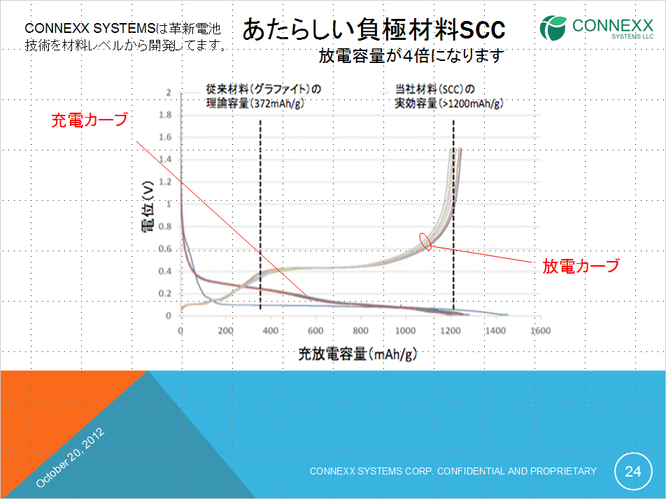 ぼくは、大学卒業以来ずっと研究者をしていて新しい材料に興味があり、いろいろやっておりまして、今持っている技術の一つが新しい負極材料の「シリコン カーボン コンポジット」です。 SCCといっておりますが、これ、こないだNHKで放送されました。 実効放電容量が1200ミリアンペアh/グラムもあり、従来のはグラファイト系の負極の実に4倍になります。 サイクル寿命も極端によく、普通のLi-ionは500サイクルで死んでしまいますが、2000㌟と寿命も大変長い。