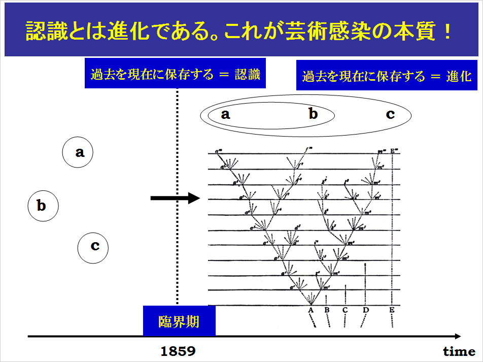 そうすると、ダーウインが進化論を思いついたというのは、二重の意味で進化です。 こちらの図(スライド11)の中では、二重の意味で過去が現在に保存された一つの絵になっています。 右側の図が、進化の系統樹。 もう一つは、それまで独立にバラバラな生物種として存在すると思われていたものが、どれもお互いに関係しあう生物種として位置づけることができた、それが横の時間軸です。 これも進化。 でも、こっちは実は認識。 進化を理解するには、認識を飛躍させていくしかないということです。 認識とは進化である。 この移行の瞬間というのが、実は、芸術の「感染」の瞬間ということです。 これ見ていただいて、「客体の理解を通して主体の理解が深まる」と書いています。 (前にも、この点に触れました。 )本当か?実は、本当です。 この絵とこの絵は同じ絵なのです。 )右側の絵を見た時は、いきなり違和感をおぼえますが、左側の絵は、単に右側の絵を反転させているだけです。 何が、本当のモナリザの絵と違うかというと、目と口が逆転しているのです。 さて、今の絵を小学校に行ってお子さんに見せた時、私の方がびっくりしました。 小学生は、見た瞬間に「気持ち悪い」といったのです。 もう種明かし分かっているのと聞くと、「だって、目と口がさかさま」という。 えー、大人はわかんないよ、と。 このように客体を通して、私たち主体のことがわかるのです。
