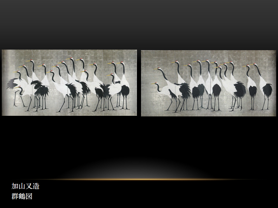 今の並木先生のお話は、すごくユニークといいますか、琳派を説明するのにこういう説明の仕方があるのかと、とても、感激して聞いておりました。 特に、ぼくは、田中一光さんっていうのは、現代の琳派ではないかなと思っていたんですが、この「JAPAN」の鹿のことは、実は知りませんでした。 それを知らずに、平面性とか色の配置の仕方とか、世界に通じる独特の造形性について、この方をこそ琳派というべきであって、よくそのようにいわれる加山又造先生は、亜流にしか過ぎないと思うんです。 その思いは、並木先生もわかってはると思いますが、今の「群鶴図」を見てもですね、光琳のものは、しっかりと二つの群れが対峙してですね、描かれてないものをちゃんと描こうとしているけれども、加山さんのは一方通行なんです。 視線が向こうに行ってしまって、そこに目がとどまらない。 画家ならば、そこに目を止めさせようとするべきであると思うので…。 関係の方がいらっしゃったらお許し頂きたいんですけれど、有能な開拓者であっただけに、いつのまにかああなられたのは、何かに取り込まれたんだと思っています。